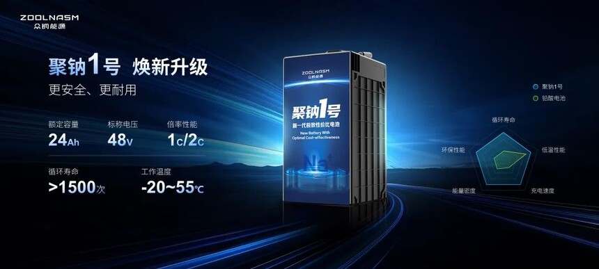 聚钠1号,焕新升级 过去的一年里,众钠能源携手爱玛、新日,与上下游合作伙伴共同努力和精心研发,聚钠一号以其全新升级的姿态亮相,这不仅是技术创新的成果,更是合作共赢的典范。聚钠1号在保持体积不变的同时,成功实现了性能的焕新升级,这一重要突破将为用户带来更加出色的续航里程和使用体验。 精益求精,质量先行 聚钠1号获得中自协团标、北自协京标的双重团标认证,完成包括爱玛、新日在内的4家头部客户的10000公里路测,并通过20项极限安全测试,产品性能获得业内全面认可。并且,公司总部、正极材料量产基地和PACK量产基地均已顺利通过ISO9001质量管理体系认证,为2024年的高质量、大规模交付提供了可靠坚实的基础。 充足产能,确保率先规模交付 众钠能源始终坚持从正极材料、电芯到PACK的全链量产能力打造,在战略合作伙伴中兴派能的大力支持下,我们快速高效地储备了充足的产能,确保及时响应市场需求。 行业首创,创新营销策略引领潮流 众钠能源携手爱玛、新日两大头部车企向前10000名预约用户提供“6年超长质保,尊享免费换新”,的营销策略,这一策略不仅展现了我们对产品品质的自信,更是对客户服务的升级承诺。